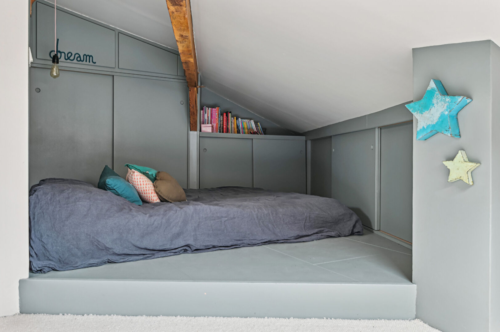 Au 2ème niveau une chambre et une grande pièce avec espace chambre et espace de rangements.