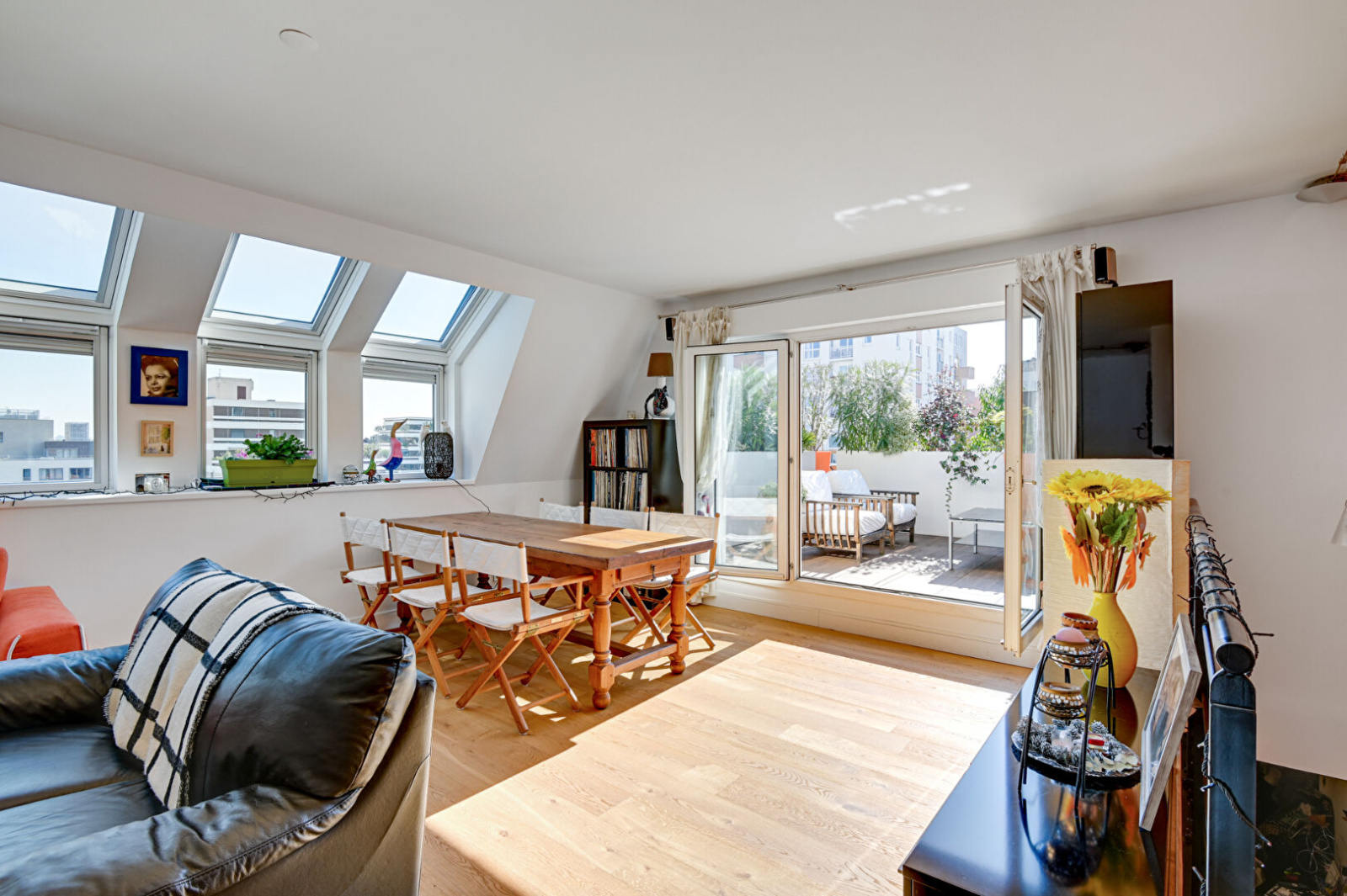 A l'étage, une grande cuisine / salle à manger avec îlot central et un double séjour baigné de lumière qui donne accès à une magnifique terrasse paysagée offrant une vue PARIS. Un Wc un indépendant avec nombreux rangements.