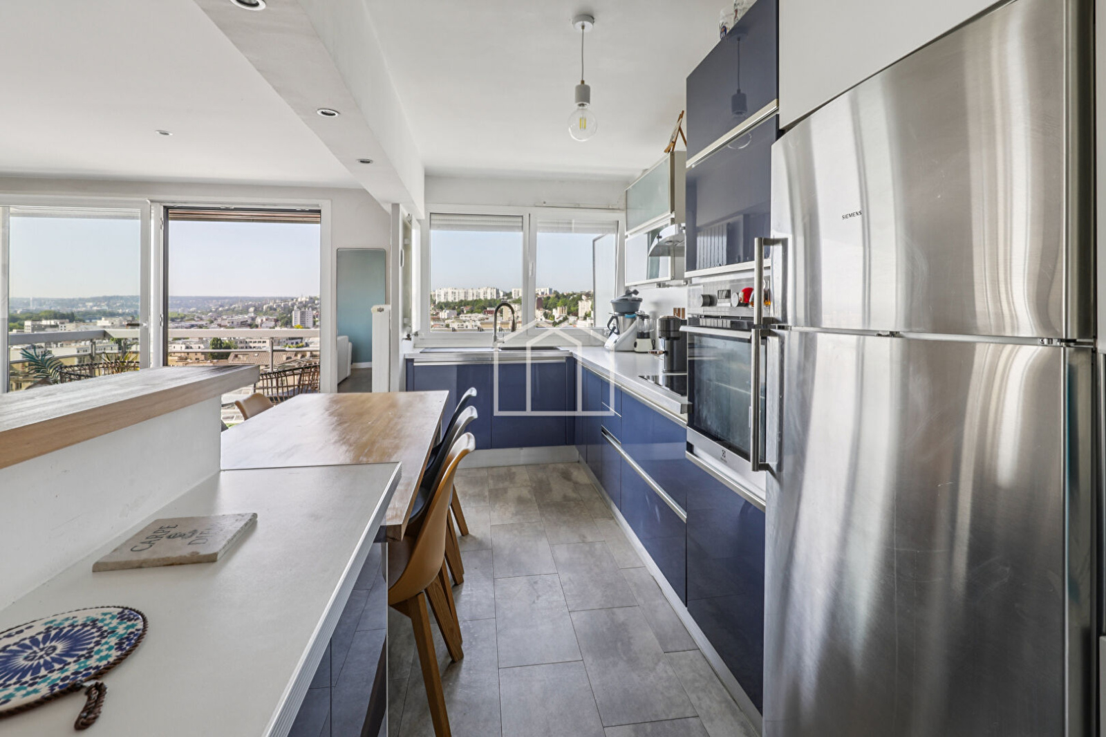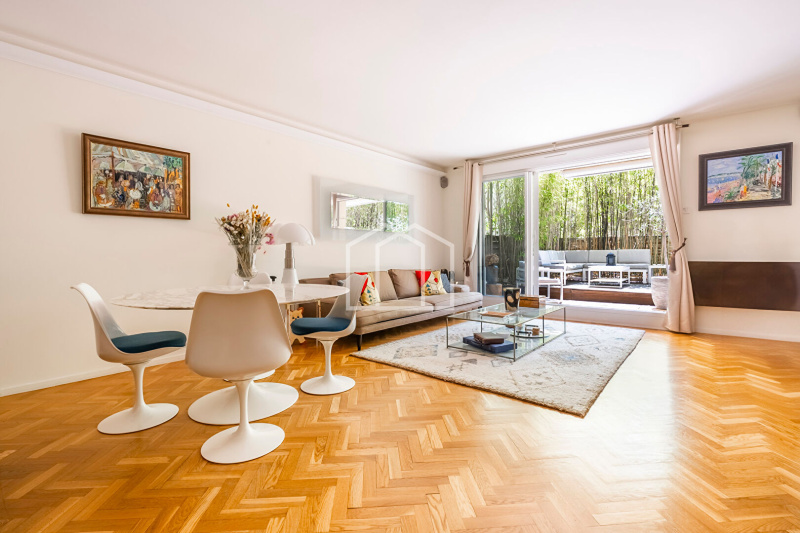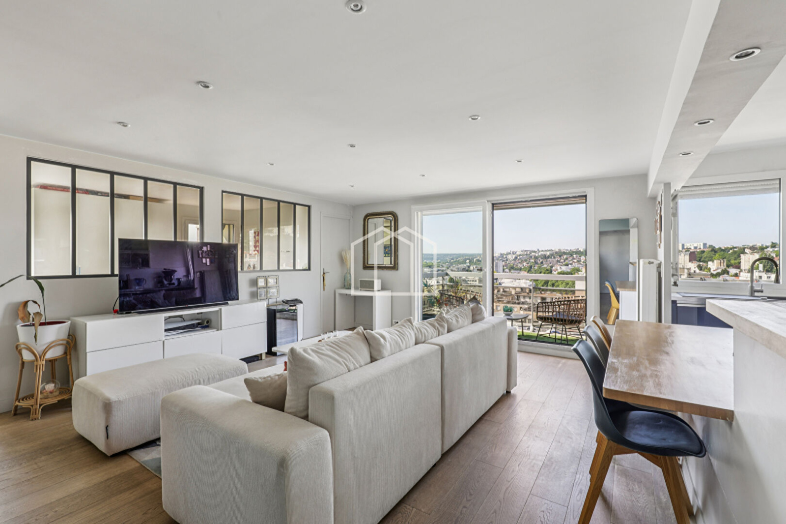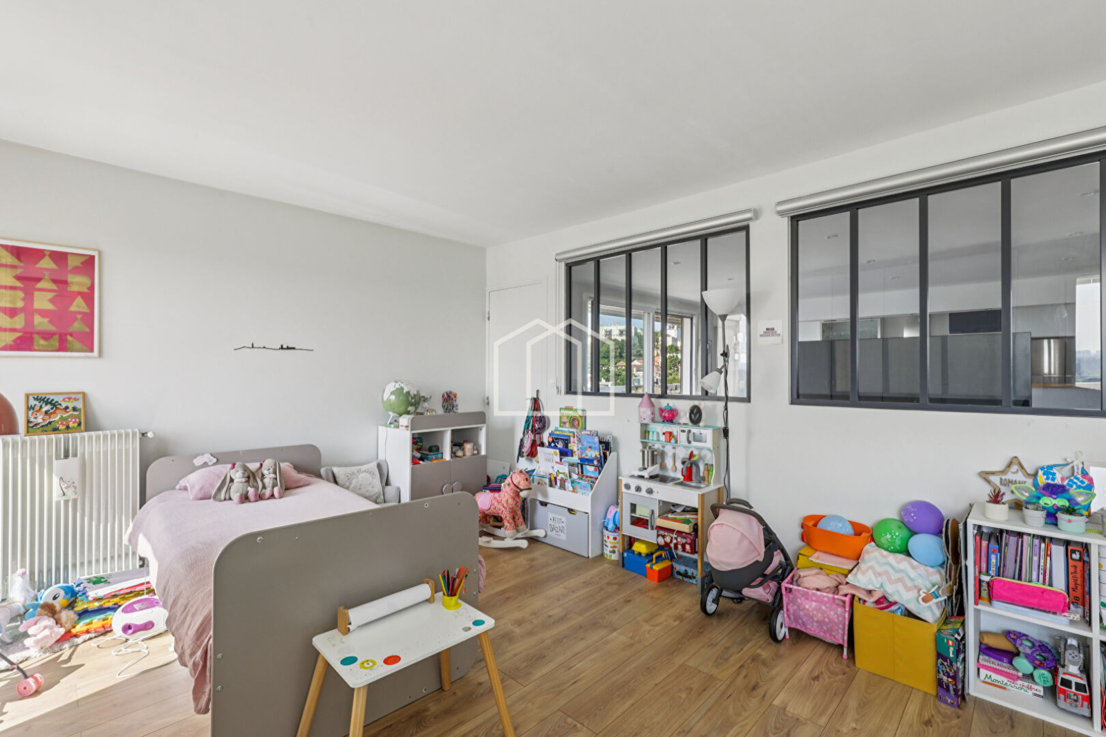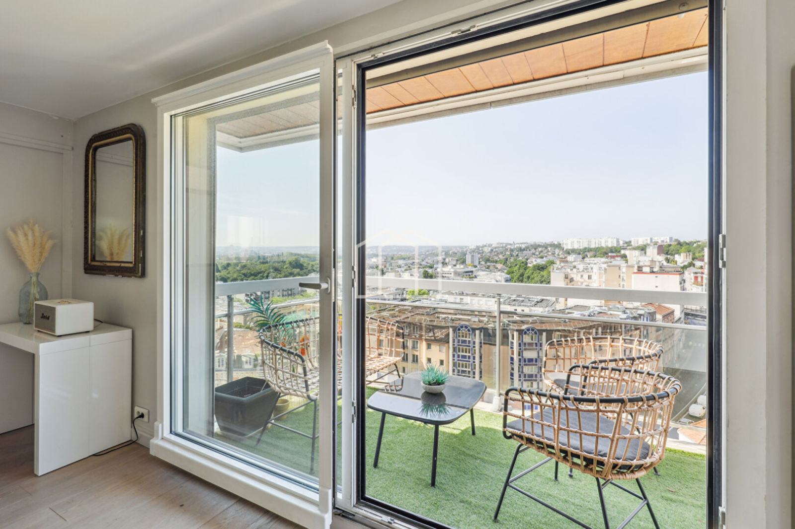 Pour les extérieurs, le séjour et les chambres donnent sur deux terrasses vue Paris et Bois de Boulogne.