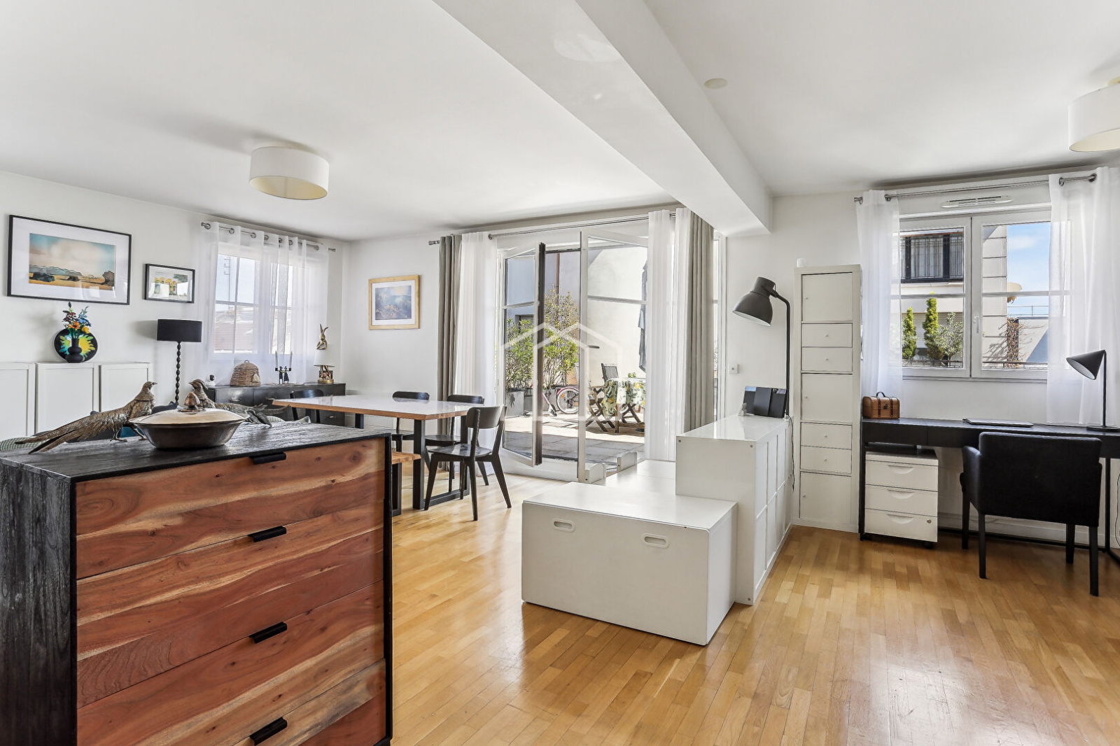 Le premier niveau propose un séjour avec sa terrasse et un coin bureau, une cuisine séparée, un dégagement et une salle d'eau avec un WC Invités,