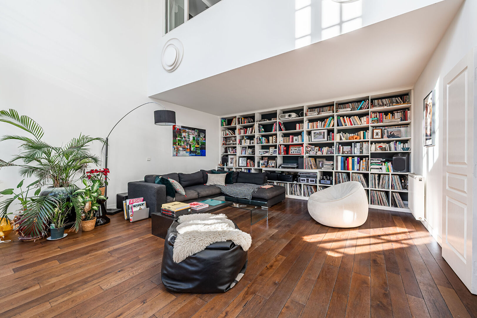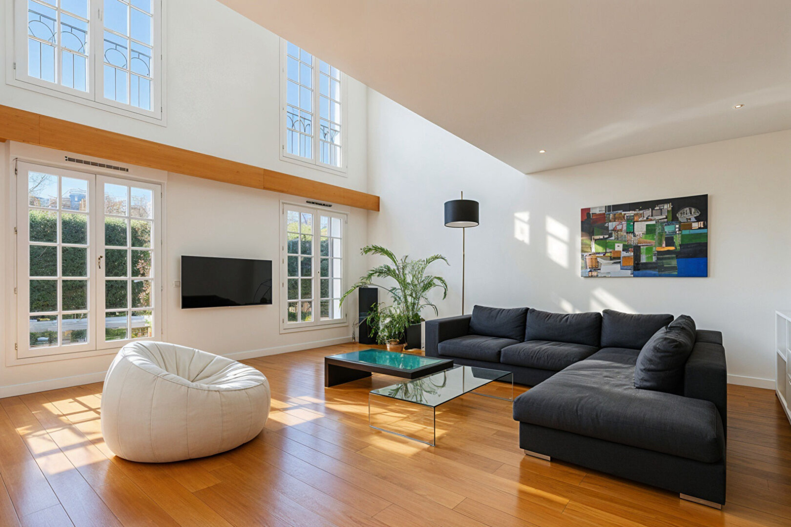 Dès l'entrée, les volumes impressionnent. Le rez-de-chaussée se compose d'une belle entrée avec dressing, d'un WC , d'un vaste espace de vie avec d'un côté une très grande cuisine / salle à manger et de l'autre d'un séjour cathédrale baigné de lumière avec 6 mètres de hauteur sous plafond. Toutes ces pièces donnent accès par des portes fenêtre à la terrasse.