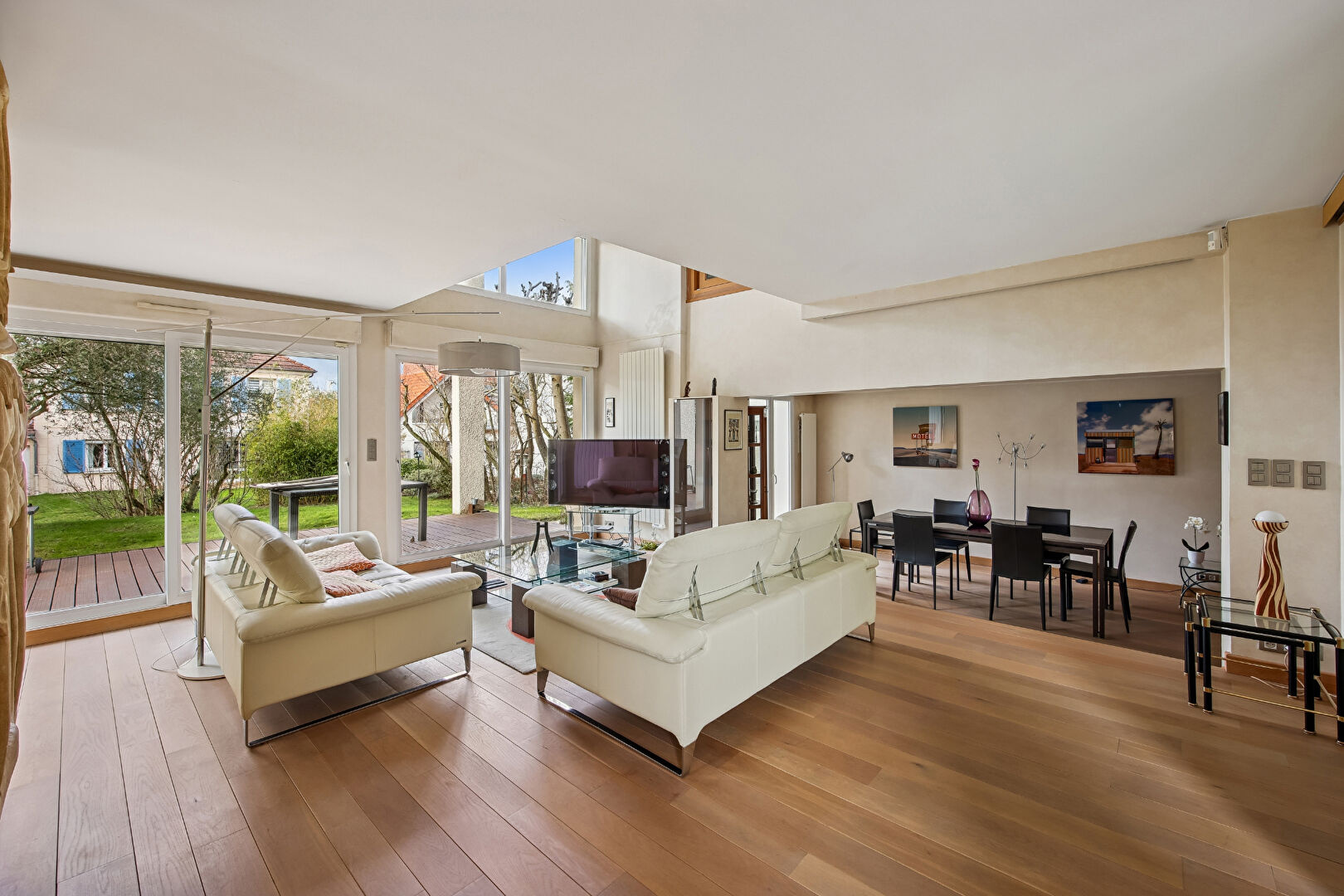 Dès l'entrée, la maison révèle une circulation harmonieuse menant à une agréable salle à manger prolongée par un séjour cathédrale lumineux et avec cheminée ouvrant sur une terrasse couverte, véritable espace de vie supplémentaire tourné vers l'extérieur.