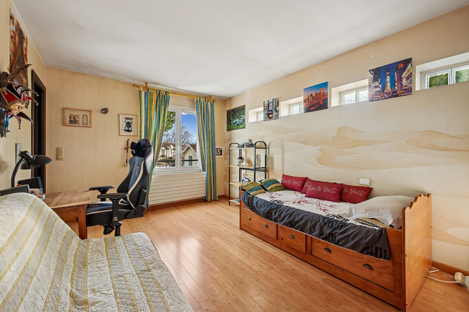 L'étage se compose d'une suite parentale, avec dressing et salle de douche privative. Il comprend également une chambre avec salle de bains ouvrant sur une loggia, ainsi qu'une troisième chambre. Un espace bureau ouvert sur le séjour cathédrale (4ème chambre possible) et un WC.
